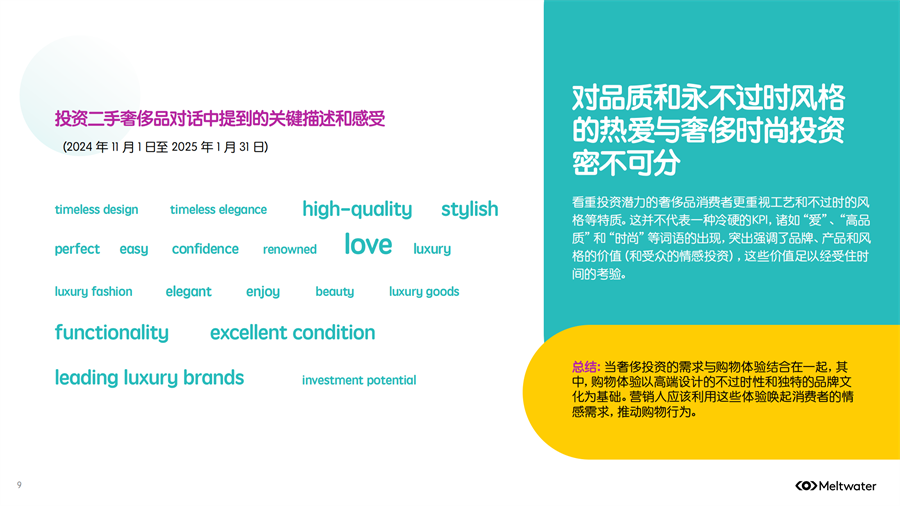二手奢侈品讨论中看重投资潜力的奢侈品消费者更重视工艺和不过时的风格等特质。这并不代表一种冷硬的KP),诸如“爱”、“高品质”和“时尚” 等词语的出现,突出强调了品牌、产品和风格的价值(和受众的情感投资),这些价值足以经受住时间的考验。