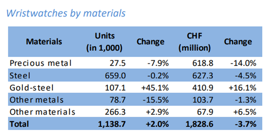 出口总额下降主要归因于贵金属腕表和精钢腕表,分别下降14%和4.5%,尽管双金属腕表出口额增长16.1%,但仍未能抵消上述影响。而出口总量略有上涨,增加了23,000枚,这主要得益于双金属腕表45.1%的增幅和其他材质腕表2.9%的增幅。价格方面,出口价格高于3,000瑞郎的腕表下滑8.1%,对总体表现造成重大影响。其他价格段的出口额纷纷上涨,尤以出口价格介于500至3,000瑞郎的腕表最为显著,上涨17.7%。