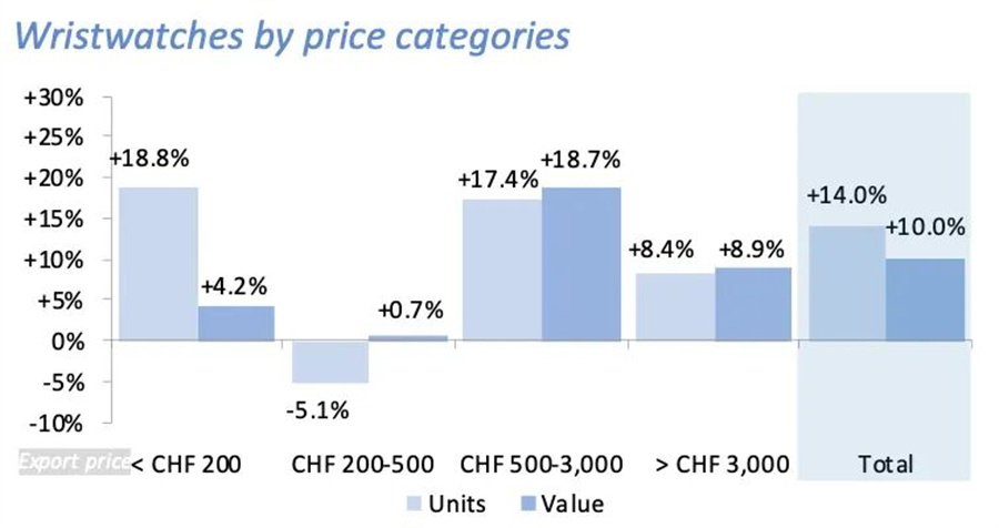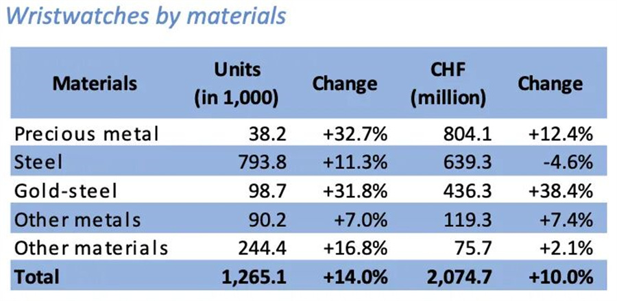 材质方面,贵金属制成的手表出口量同比增长32.7%;出口额同比增长12.4%。钢和金制手表出口量同比增长31.8%;出口额同比增长38.4%;仅钢制腕表出口下降4.6%。价格方面,500法郎以上价位腕表成为主力增长点。在500~3000瑞士法郎的手表出口量同比增长17.4%,出口额同比增长18.7%。价格在3000瑞士法郎以上的手表出口量同比增长8.4%,出口额同比增长8.9%。